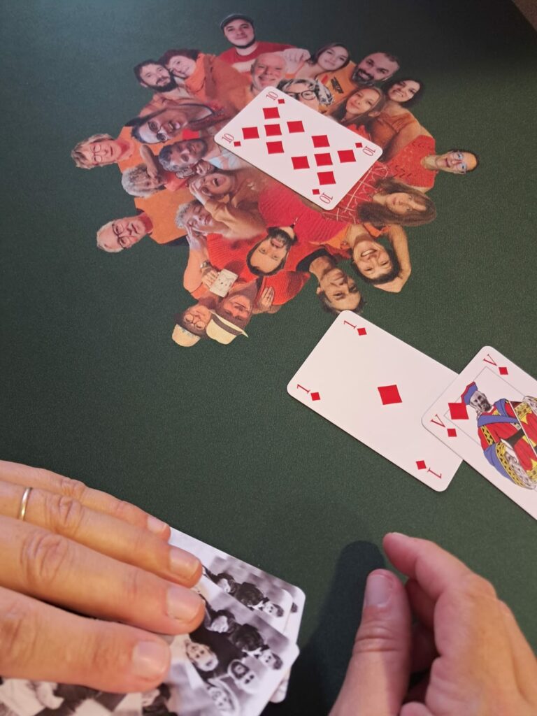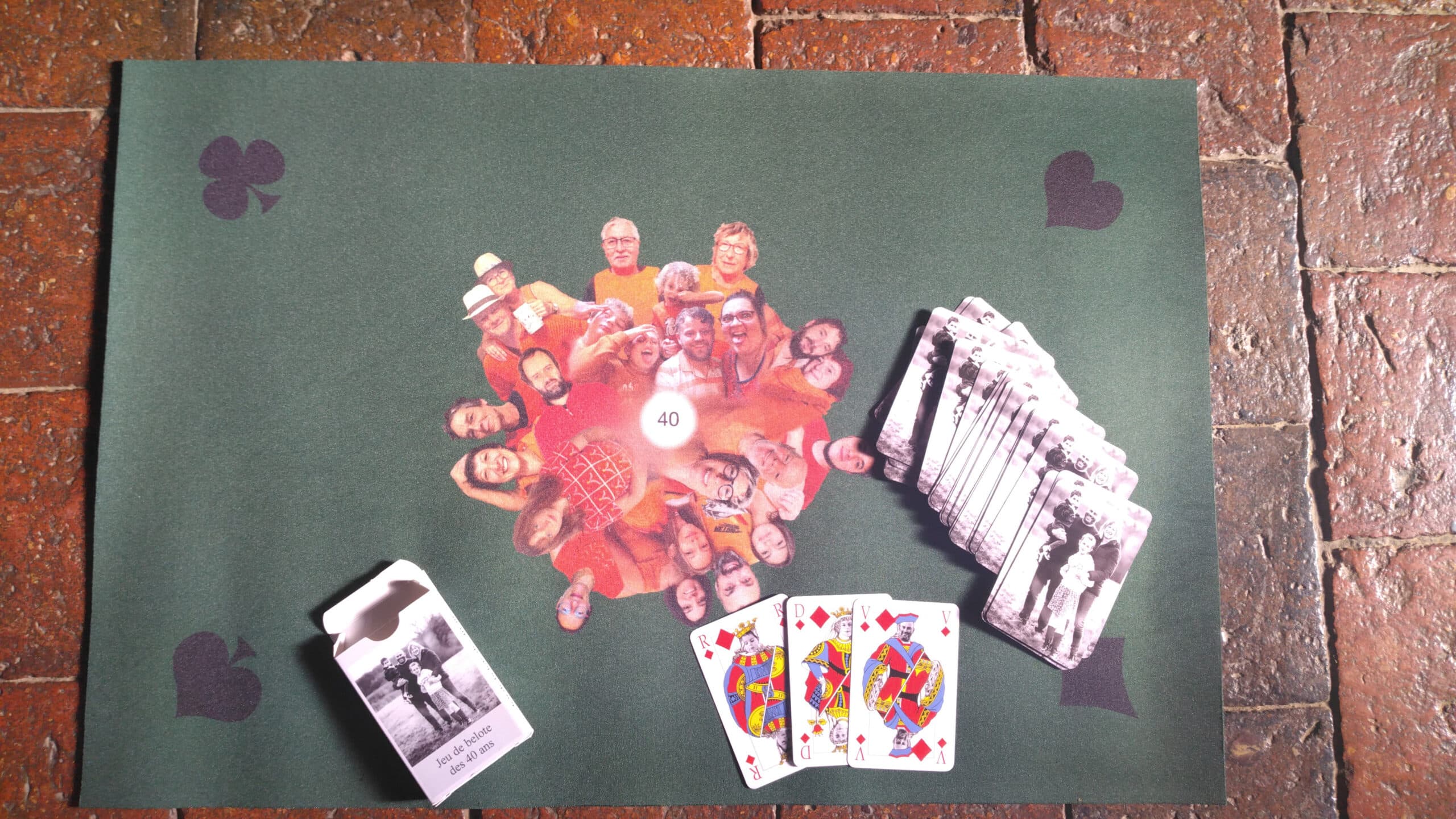 Les têtes des rois, reines et valets ont été remplacées par celles du mari de son amie et de ces deux enfants, avec en complément un tapis de jeux avec au centre les photos de ses copains.